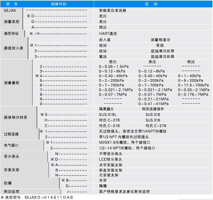 特点:·测量介质:液体,气体,蒸汽·基本精度:0.1%FS、0.2%FS、0.5%FS·宽量程比:100:1·测量范围:差压50Pa~7MPa 表压120Pa~41MPa 绝压1kPa~7MPa·电源:12.5~45VDC·输出信号:4~20mA叠加HART协议数字信号